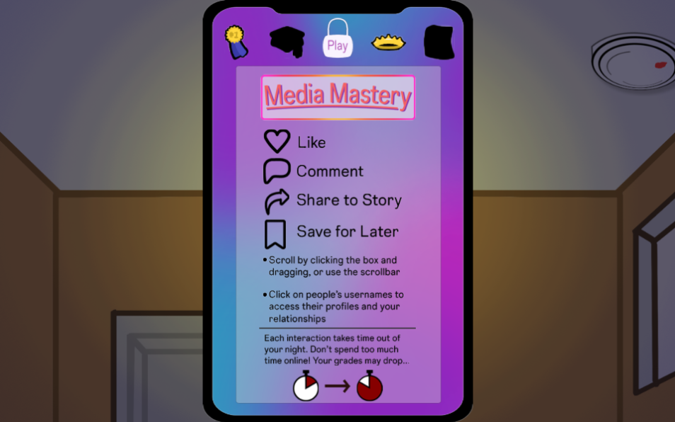 Media Mastery is an educational 2D, branching-narrative, social media simulation game meant to facilitate learning media literacy for late-middle schoolers and high schoolers. Follow the online, daily timeline of a town’s local high school leading up to their prom and graduation by scrolling through posts, as well as special events that occur based on certain post interactions or dialogue choices. Learn how to navigate interpersonal relations on the internet through a realistic social media simulation.
